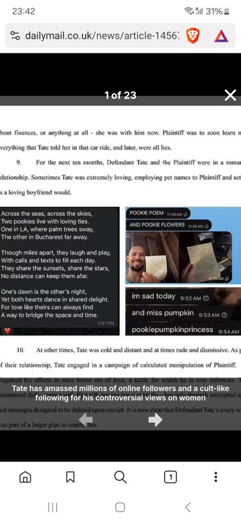 - His texting style is very oddball. It’s a mixture of reactive and unoriginal. It’s overly sentimental and cloying: it’s saccharine and insincere. “One’s dawn is the other’s night, / Yet both hearts dance in shared delight” and the nickname “pookiepumpkinprincess” are, to me, toe curlers. He sent these not as a mocky jest, but as heart felt. It’s putrid. Just what IS Andrew Tate??